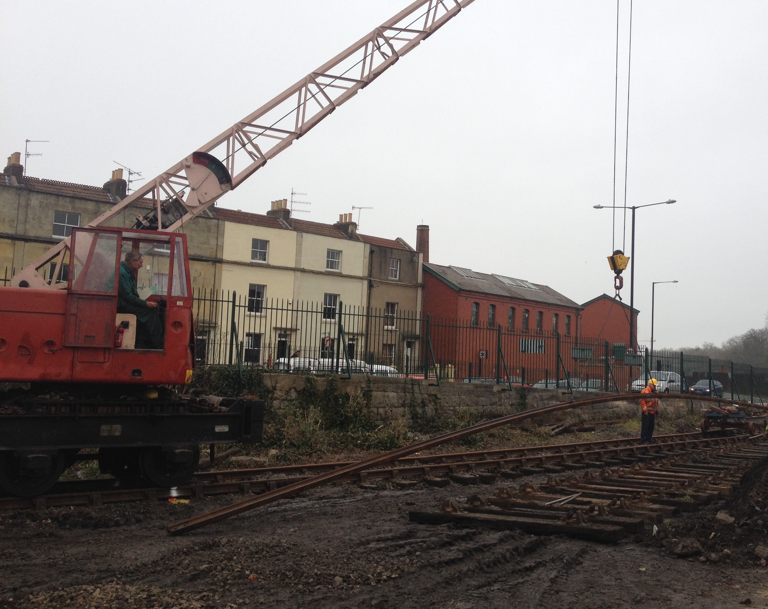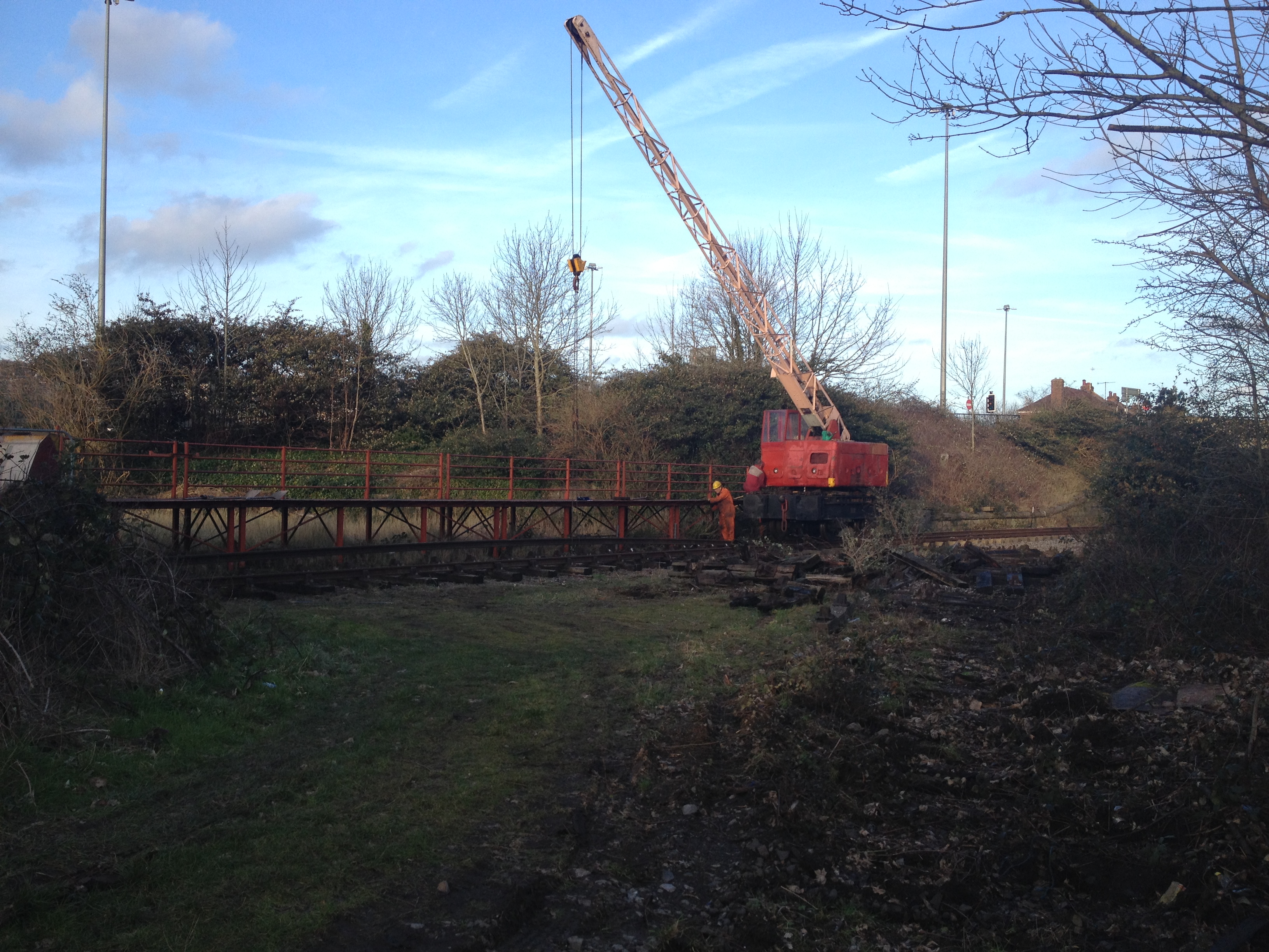 The self-propelled crane was in the process of bringing rail down from the junction….