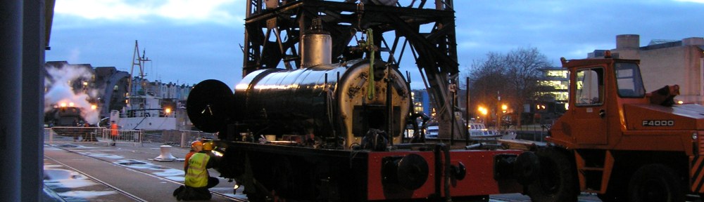 In order to do this, the temporary track was extended out of the workshop, and a commercial crane was employed to turn the frames through 90 degrees and onto the quayside track. Portbury was able to bring the boiler on its trolley down to the quayside, where it was lifted into the frames. It was nearly dark by the time the operation was completed.