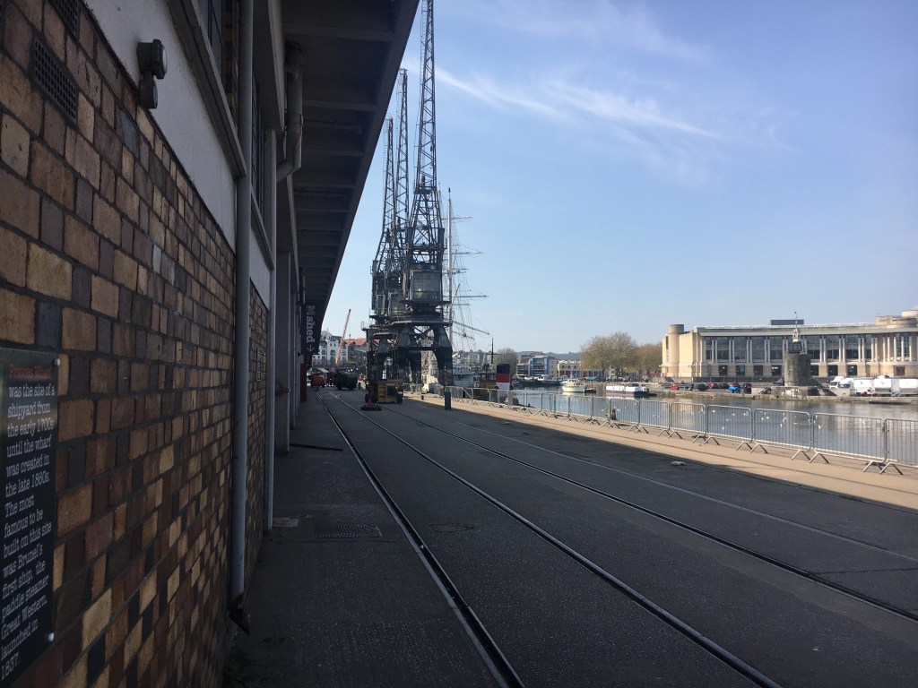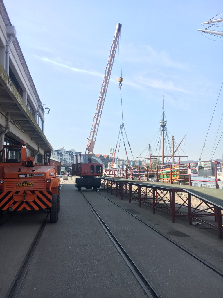 In order for this to happen, the M Shed station platform had to be moved down to the far end of the quay, near the cafe. Here it is midway through reassembly (while the cranes were being moved).
