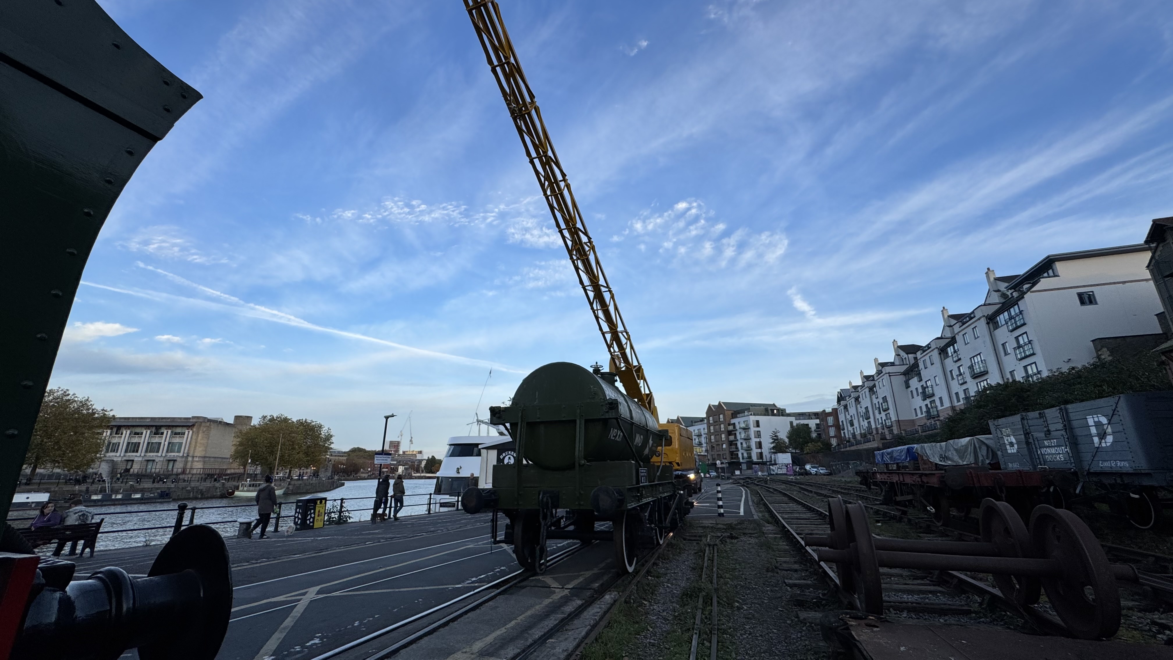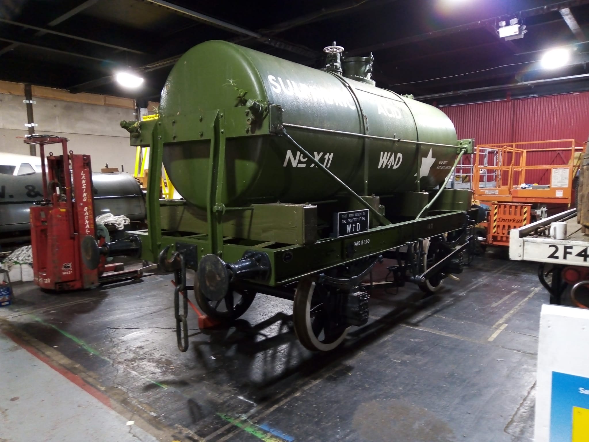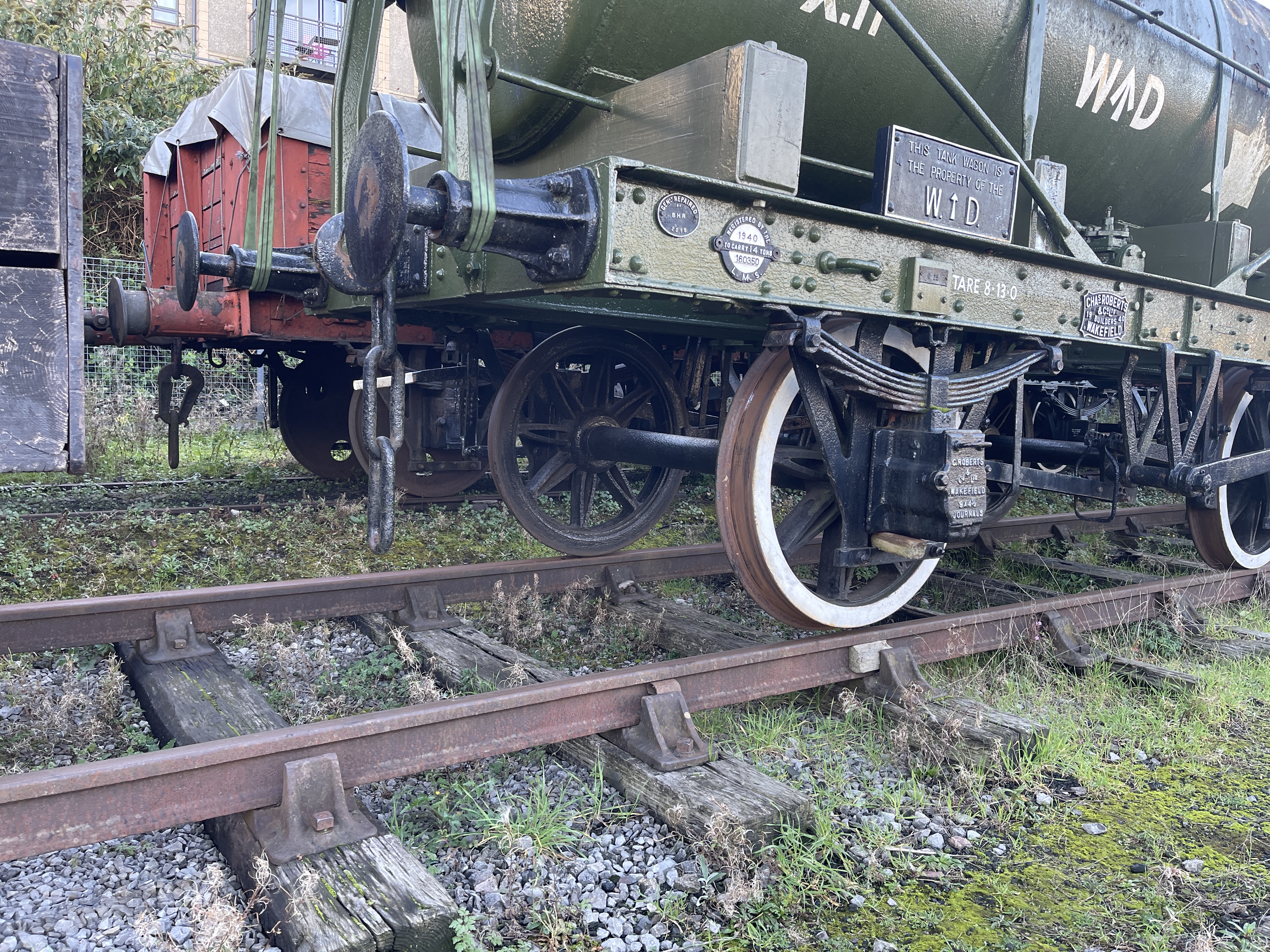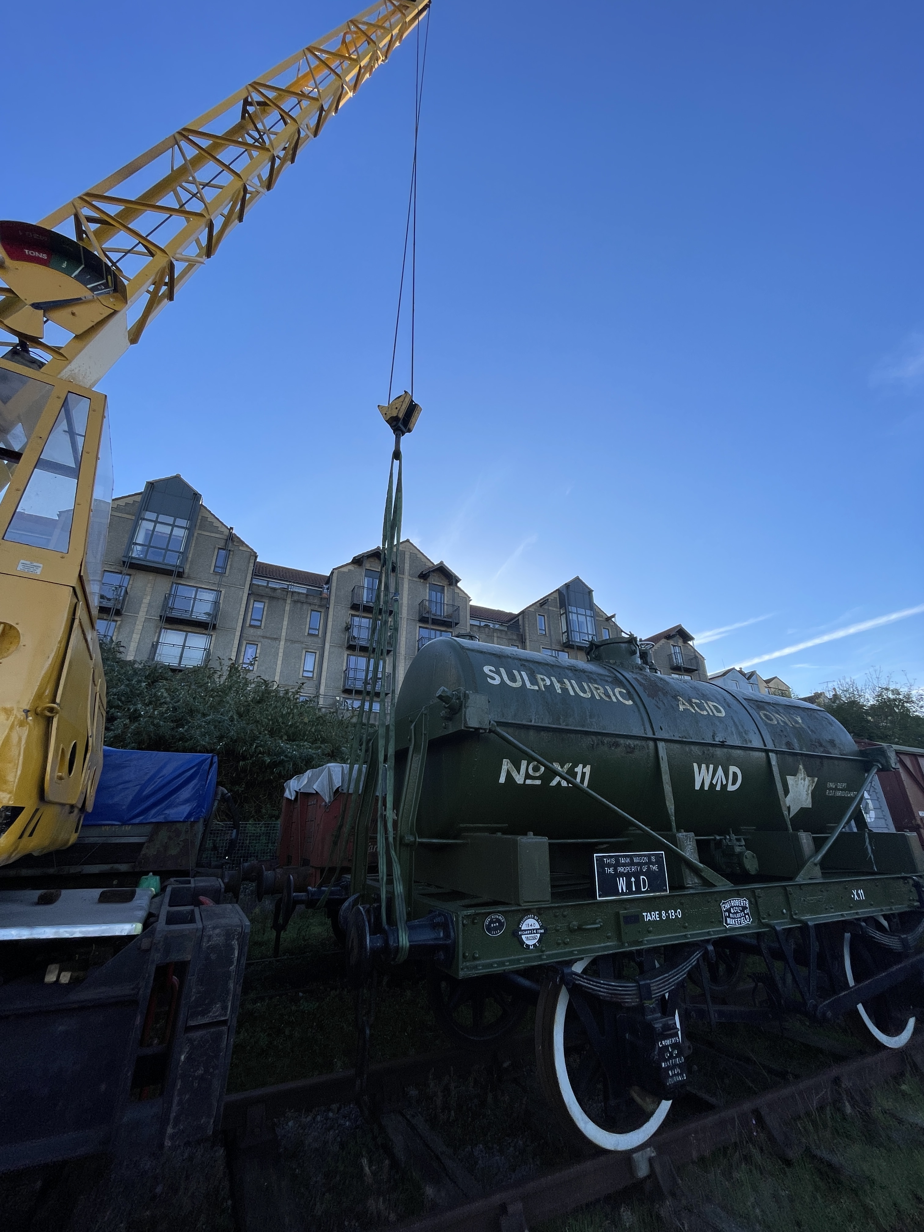 The tanker was picked up and turned 90 degrees today to get it into L Shed. The plan is to give the tank a spruce-up as it’s suffered more than the chassis out in the open and the paint is looking rather tatty. The Coles Crane slewed the wagon around by picking up the end and moving it over a piece at a time. Thanks to Chris E for the photos.