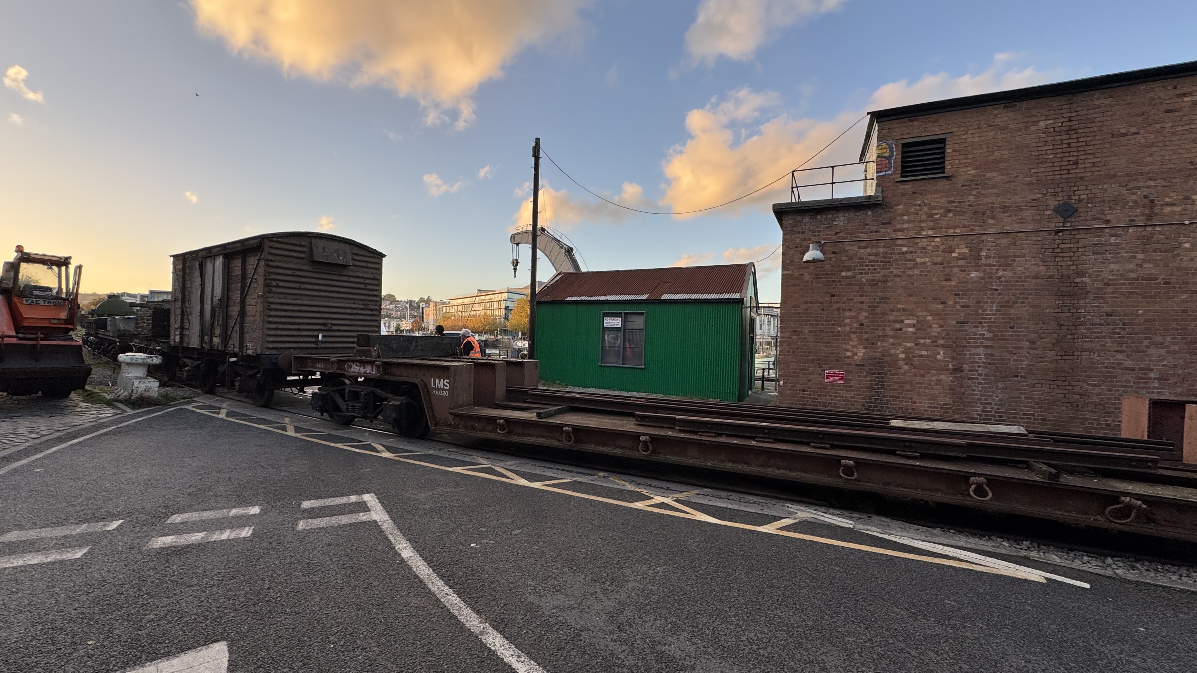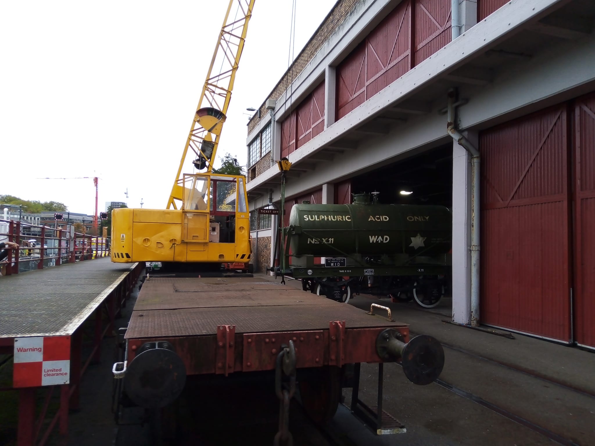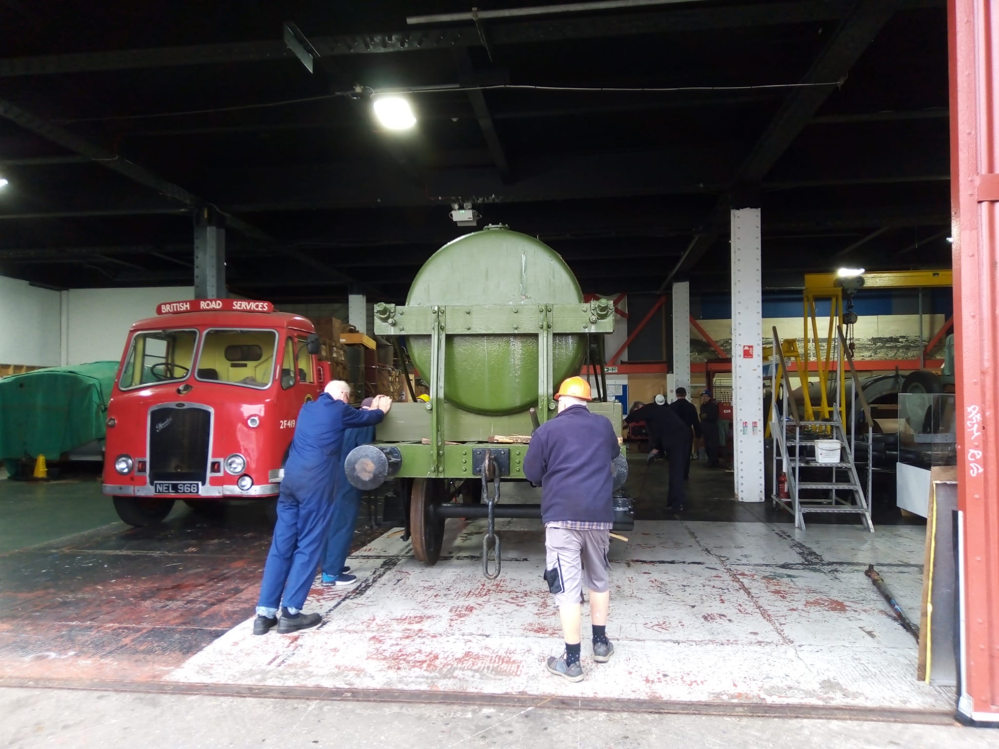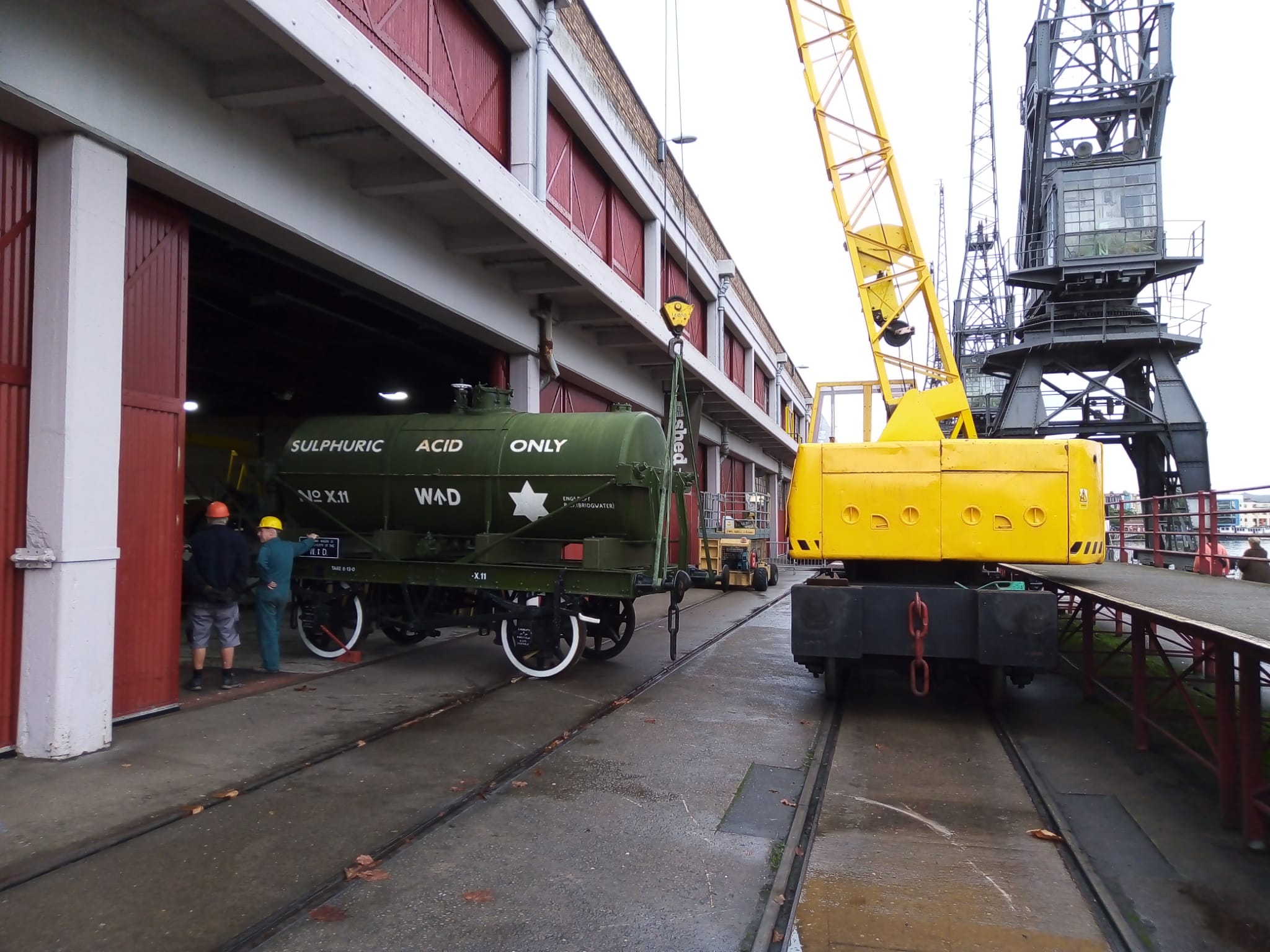 This includes getting the tank of the Sulphiric Acid Tanker rubbed down and repainted. The chassis is still in good condition but the tank has suffered a bit from flaking paint and rust bubbles. The Coles Crane was used to bring the tanker out of the yard and set it down on to Henbury at the end of the working day. The steam loco then propelled it onto the quayside to be pressure-washed. Earlier in the day we did a test lift to ensure the crane would be able to slew it into the warehouse.