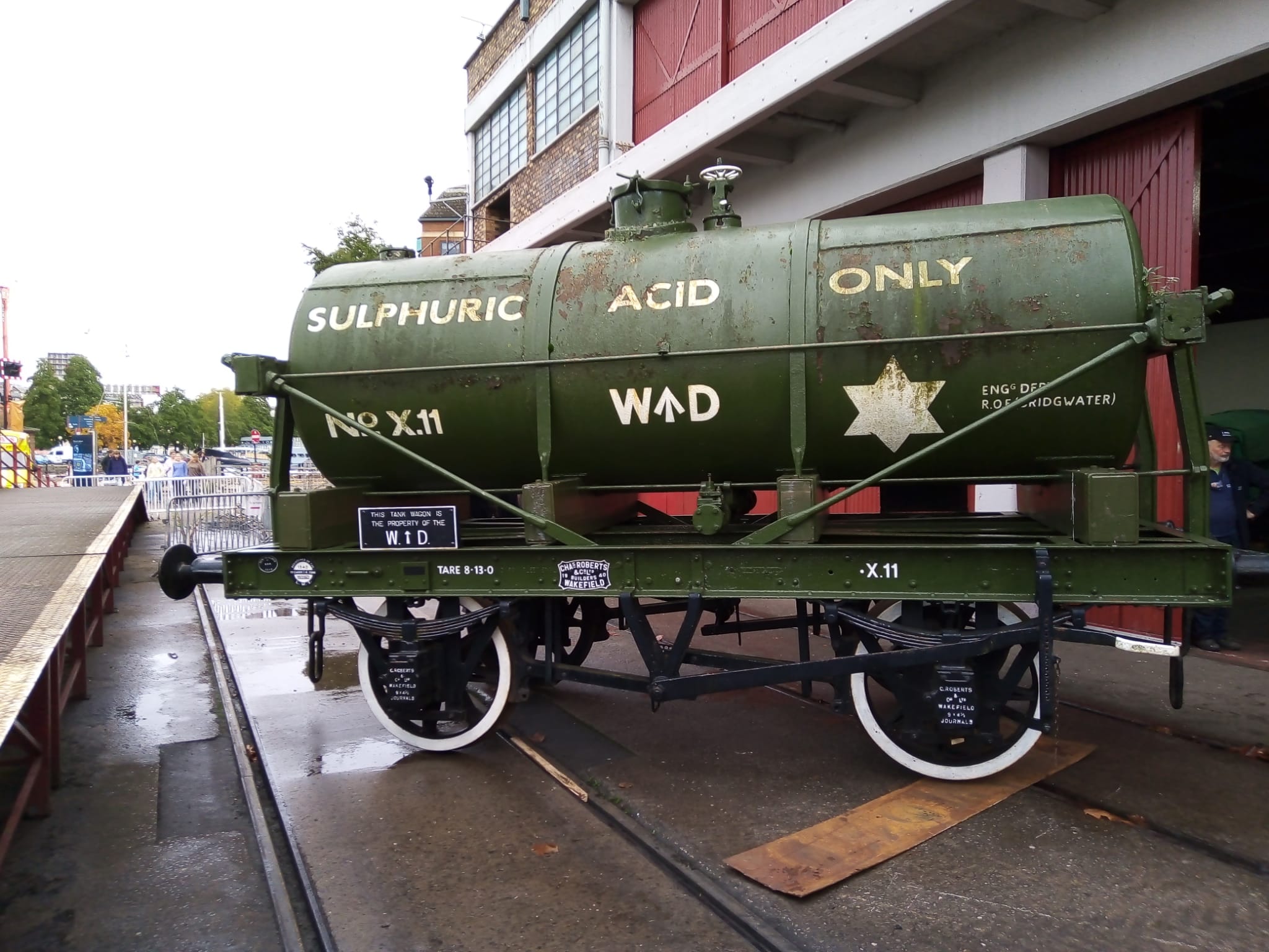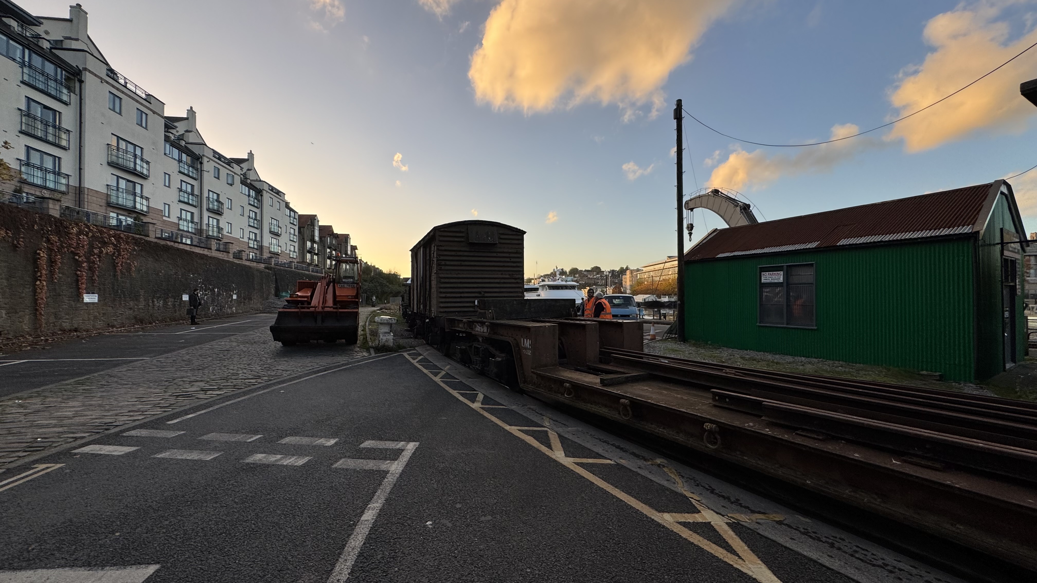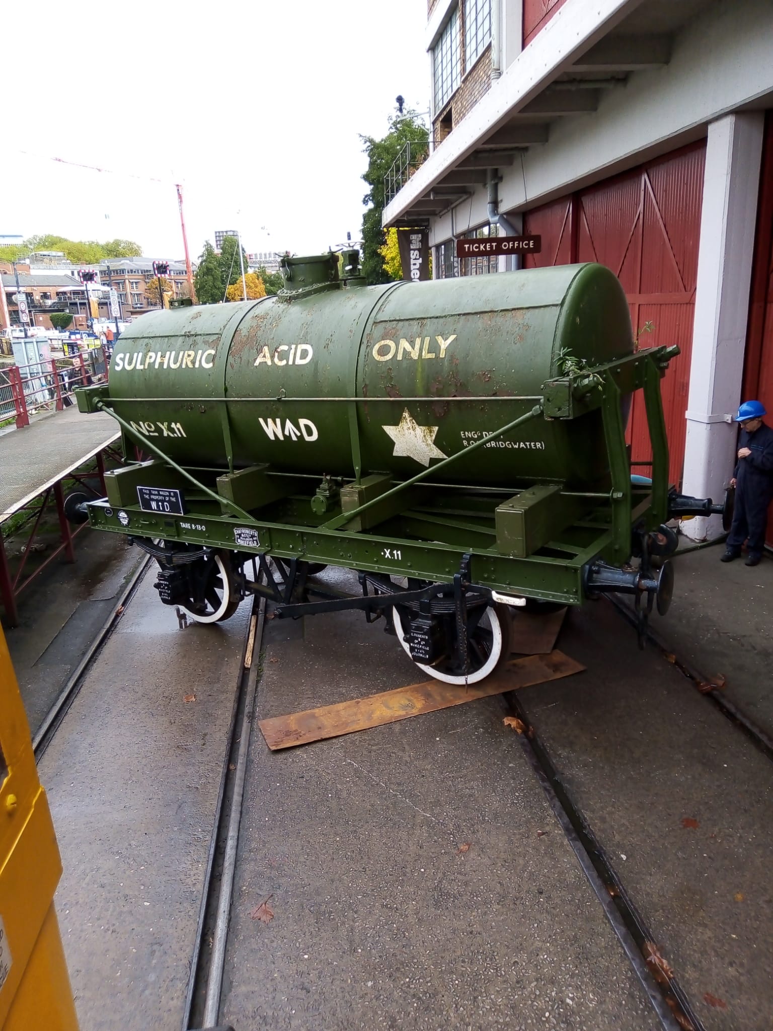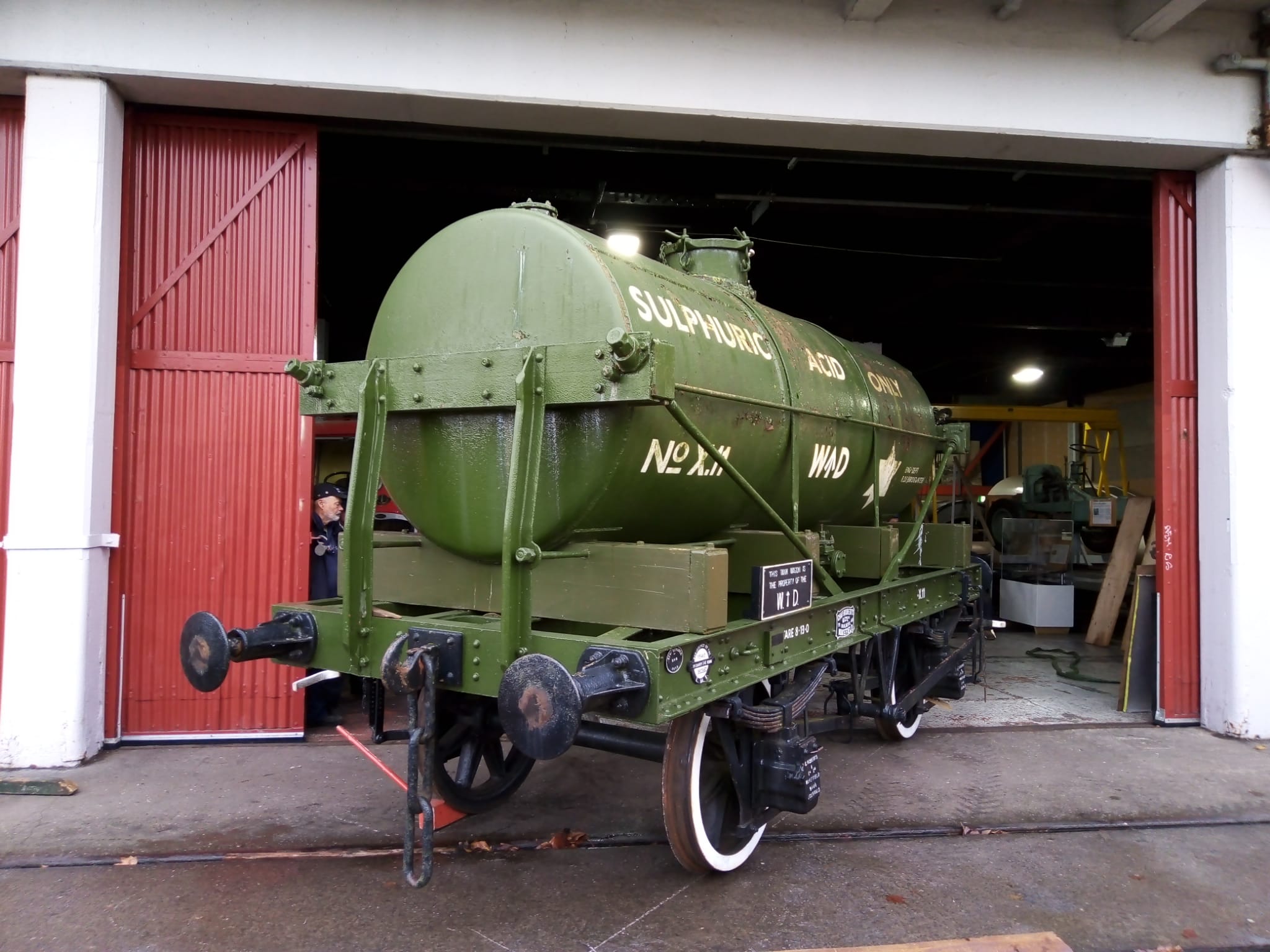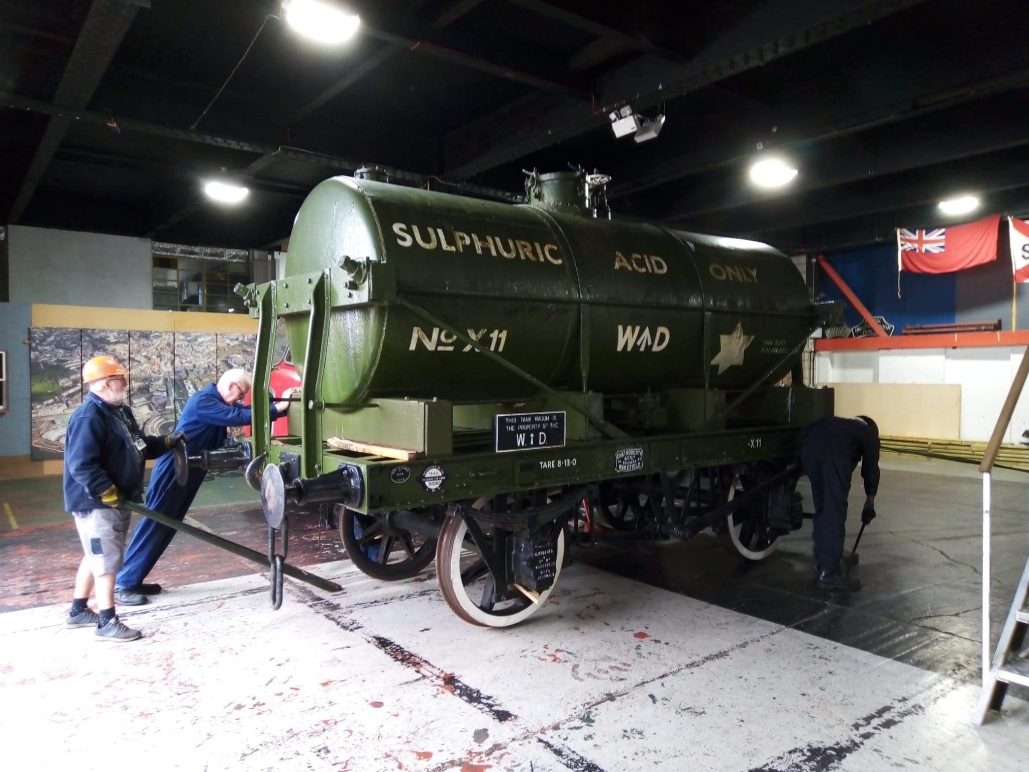 This includes getting the tank of the Sulphiric Acid Tanker rubbed down and repainted. The chassis is still in good condition but the tank has suffered a bit from flaking paint and rust bubbles. The Coles Crane was used to bring the tanker out of the yard and set it down on to Henbury at the end of the working day. The steam loco then propelled it onto the quayside to be pressure-washed. Earlier in the day we did a test lift to ensure the crane would be able to slew it into the warehouse.