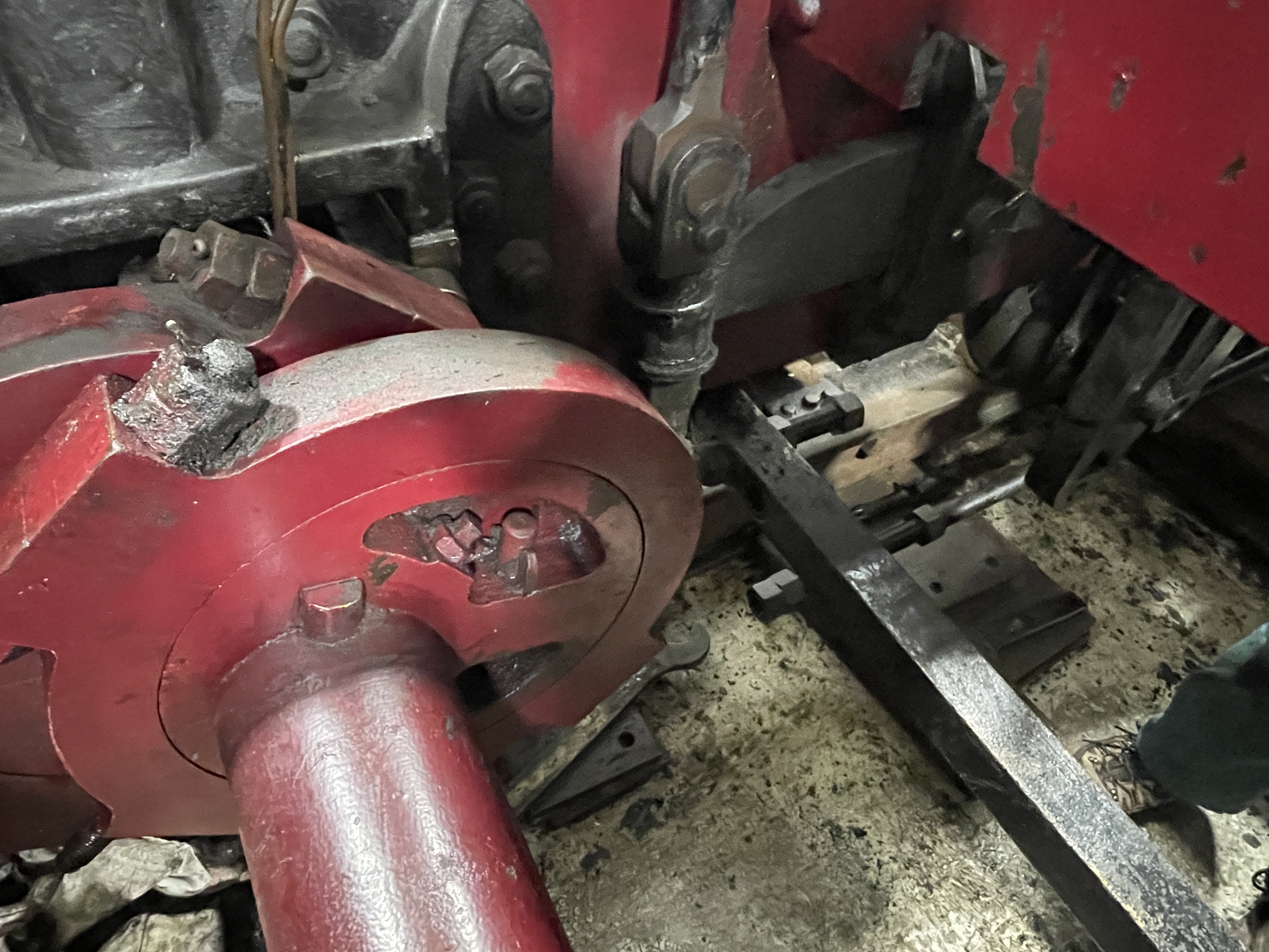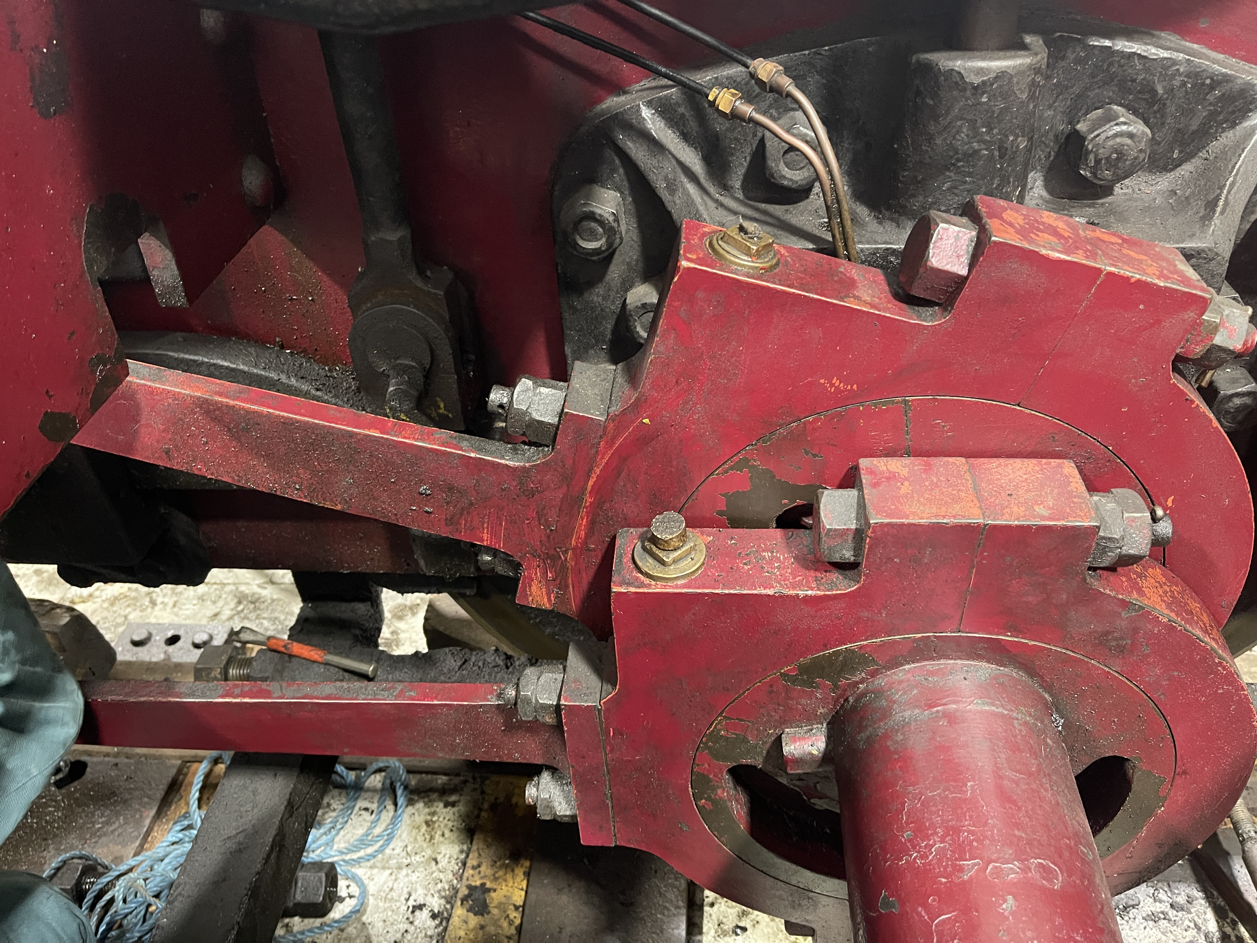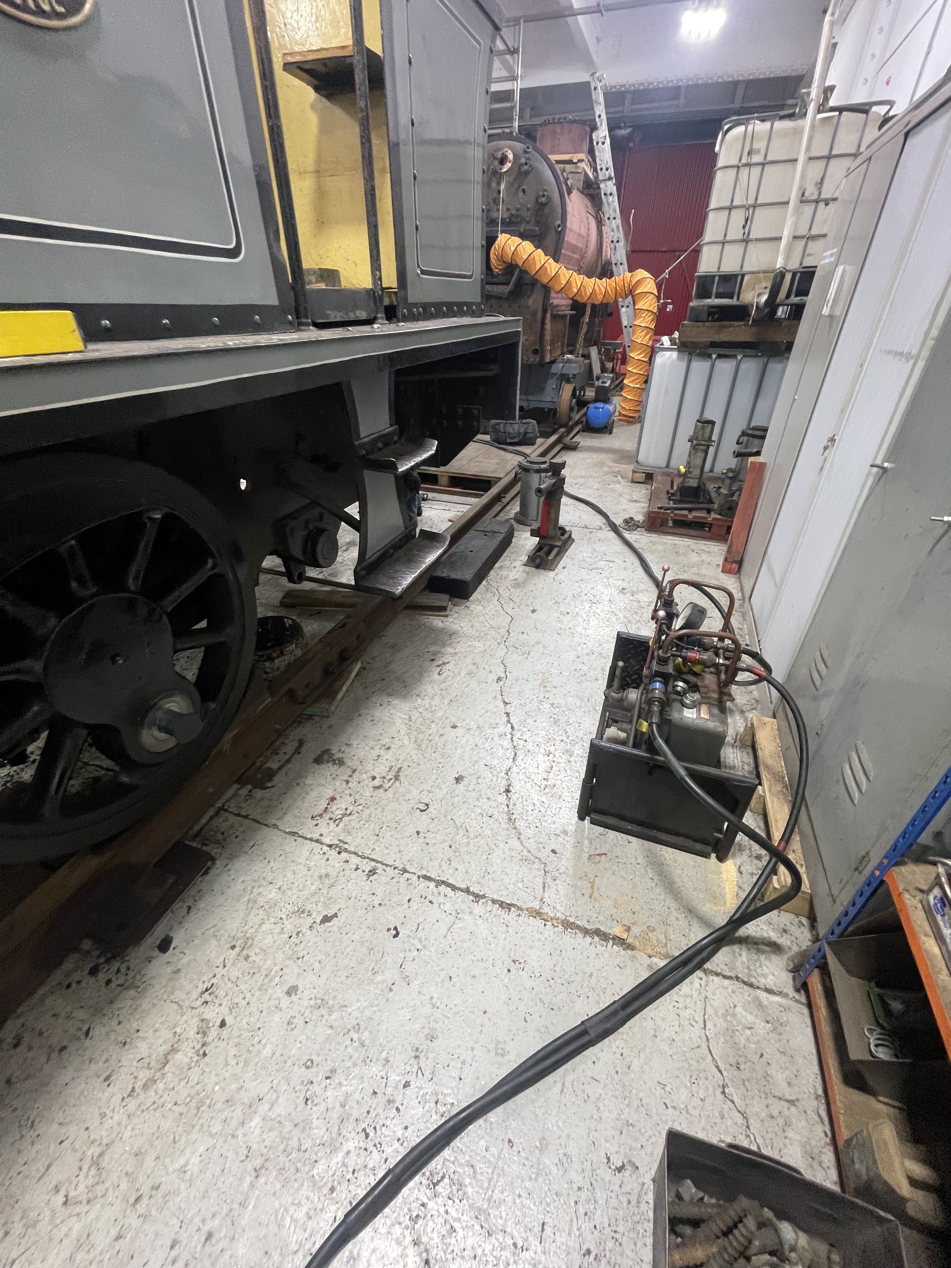 With all the gubbins out of the way, the process of jacking the loco up can start. 2 hydraulic jacks (one at each end) with 4 screw jacks (one on each corner) and plenty of timber packing. By the end of the day, we had nearly lifted the loco enough to drop the axleboxes out of the hornguides.