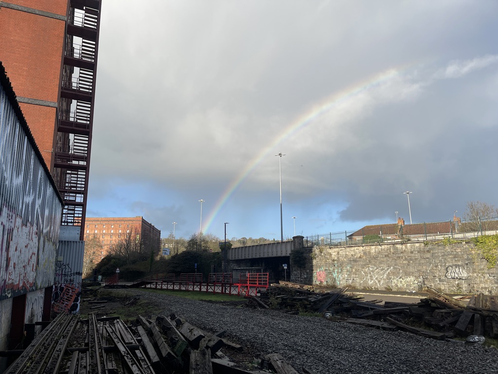 Day 1 kicked off with a lovely rainbow, and cutting down the contractor’s fence that blocked access to the branch alongside the chocolate path. Then some short rail was dragged out of the pile to be used.