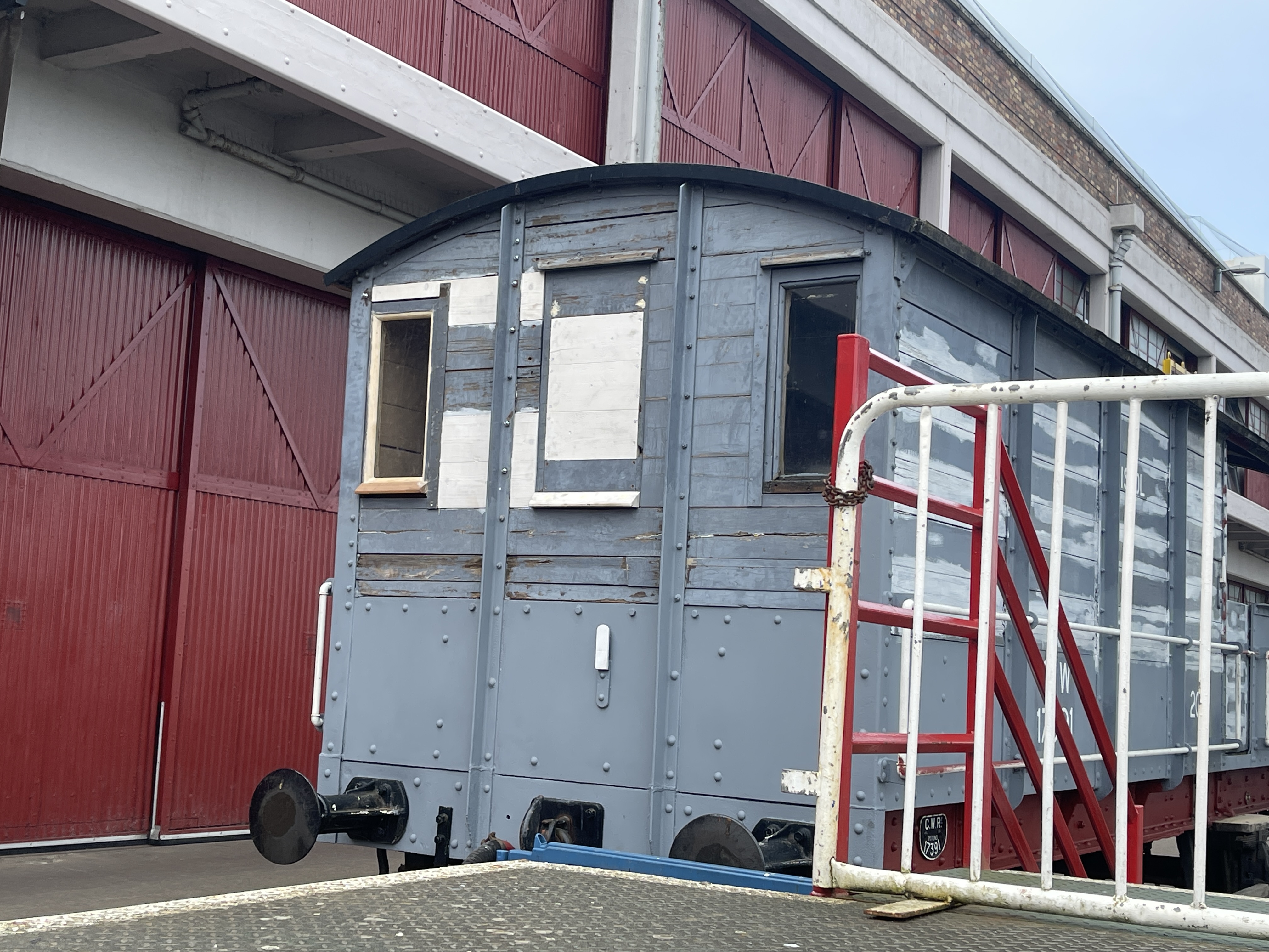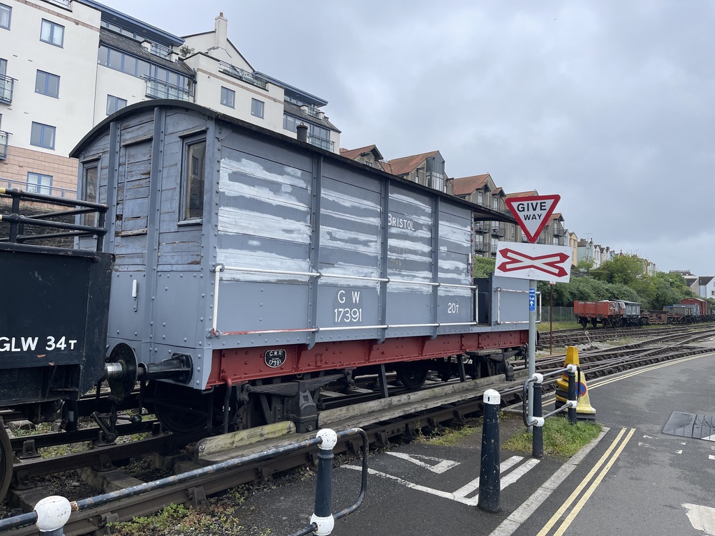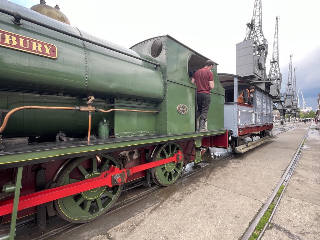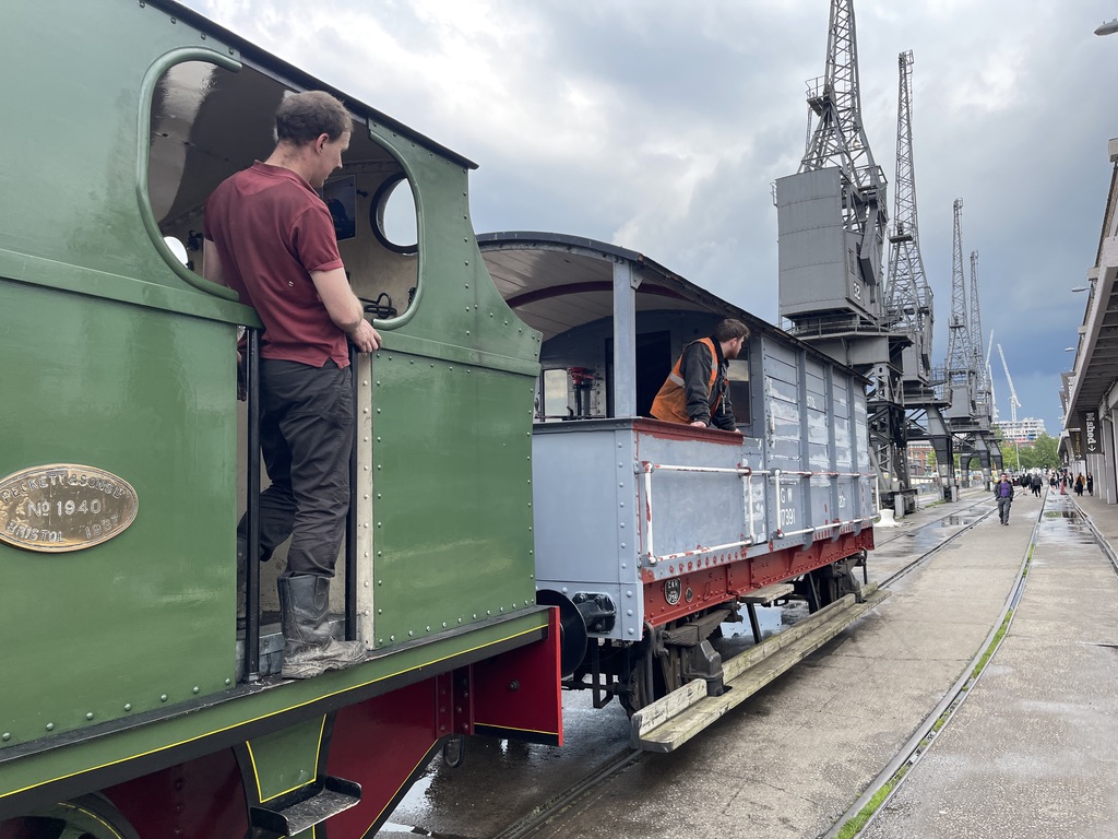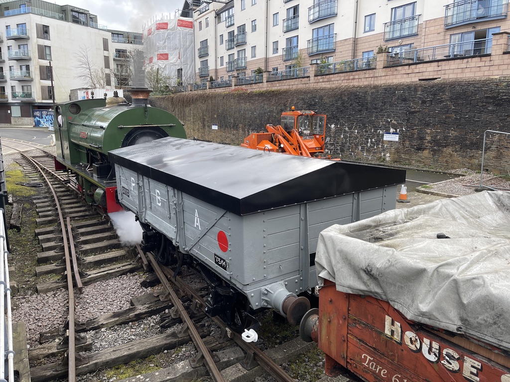The Toad brake van has been receiving some tender loving care, including replacement wood and repainting. This involves shunting it on to the quayside so it can be outside the workshop.