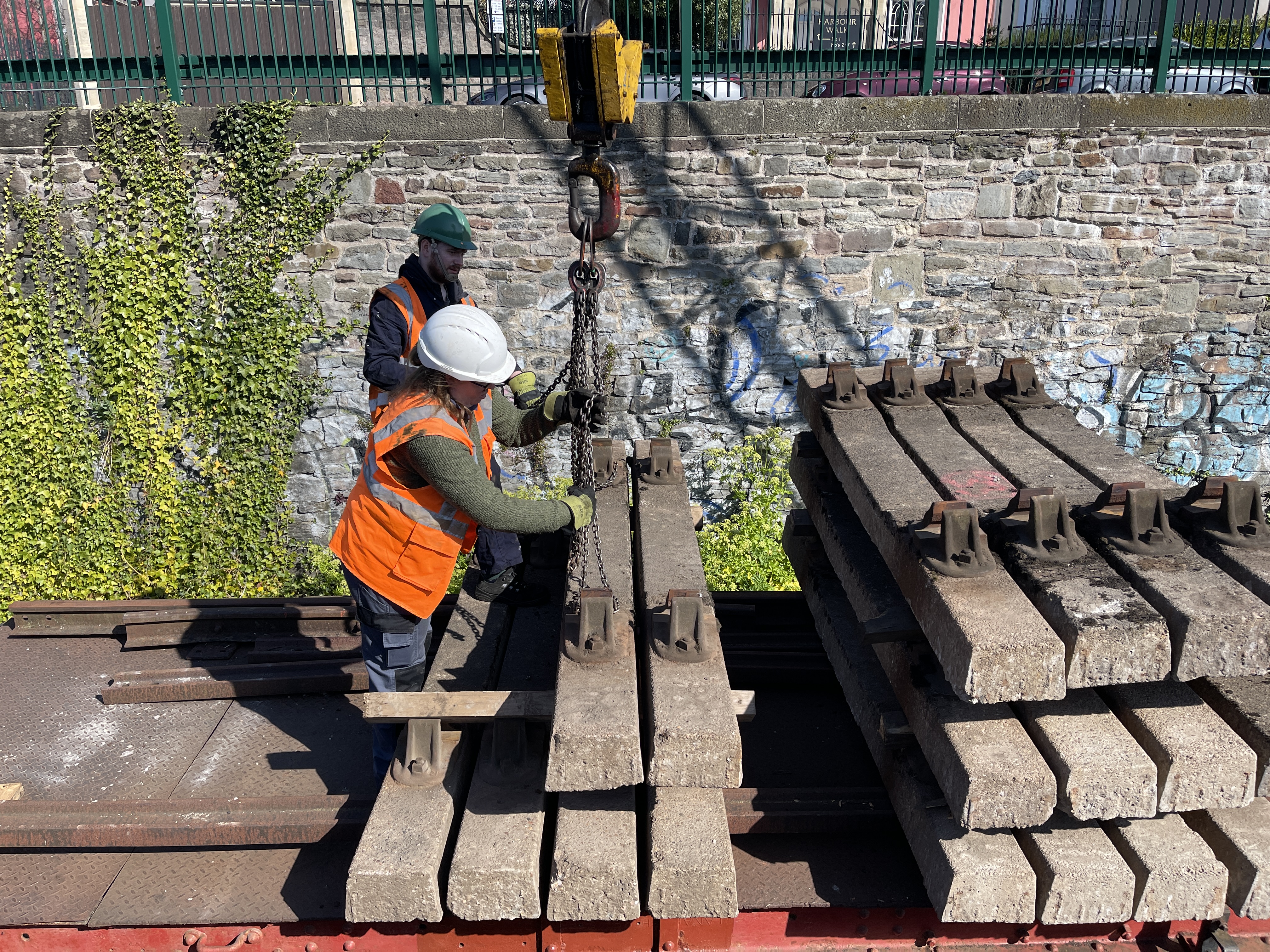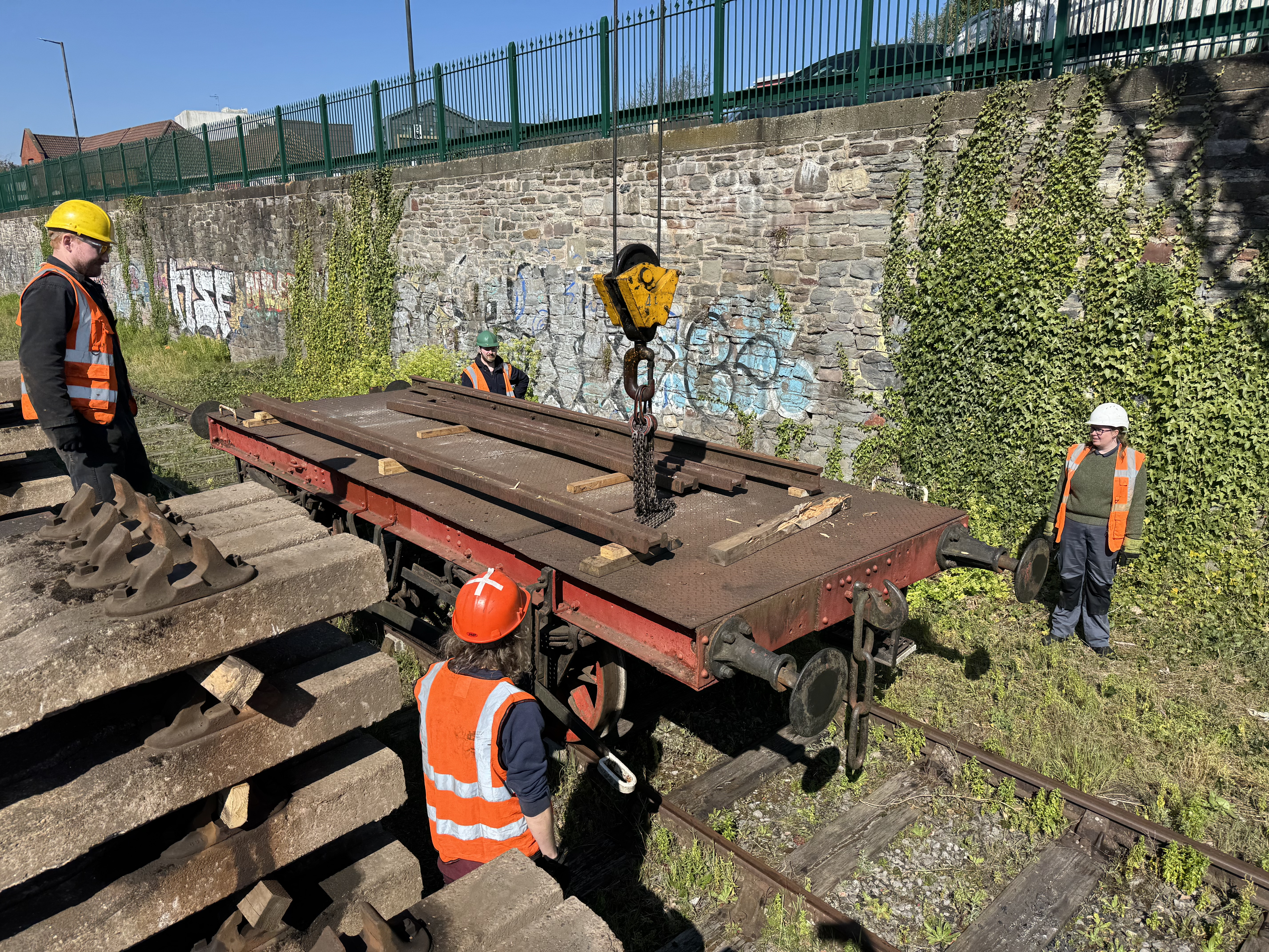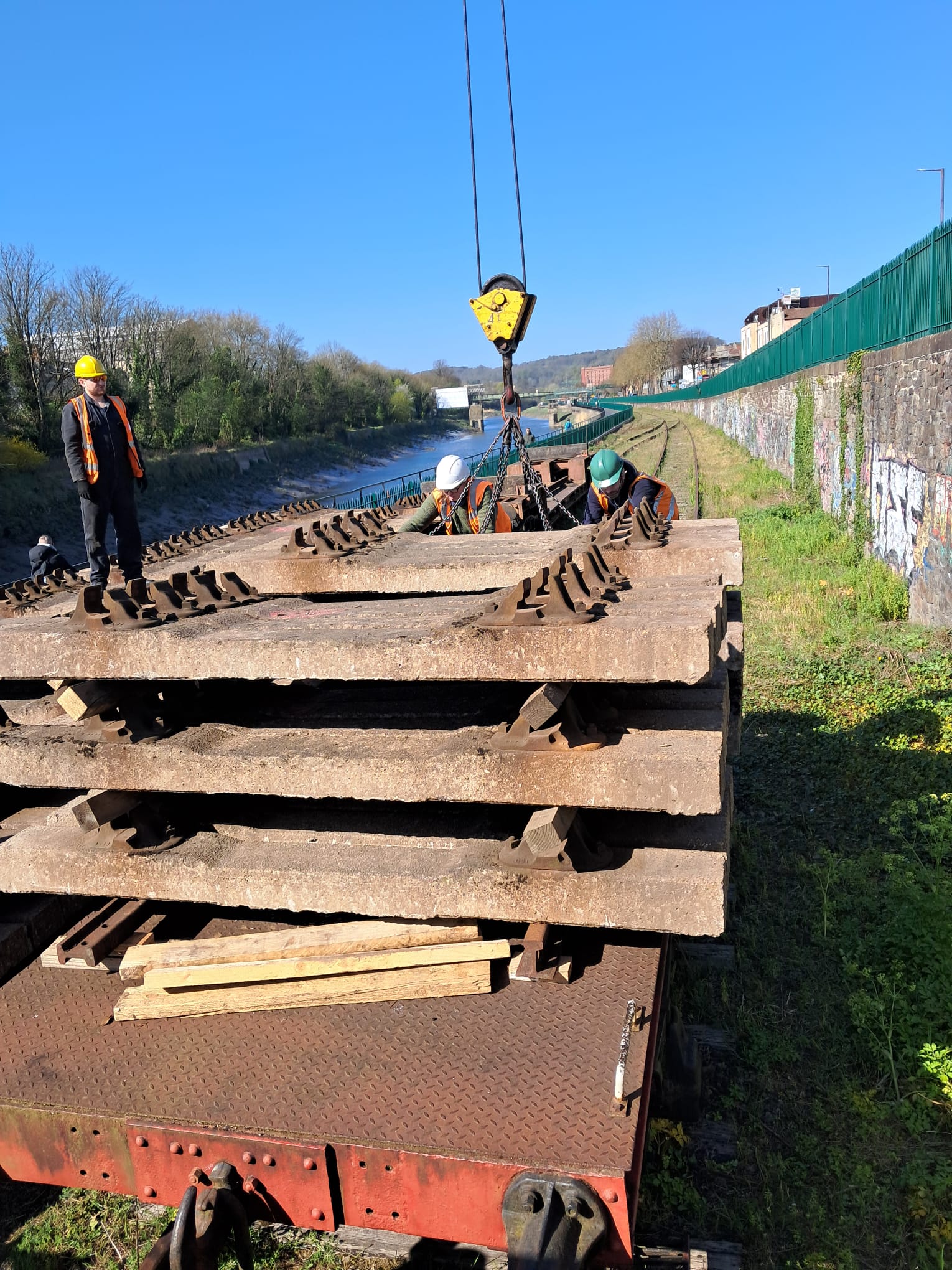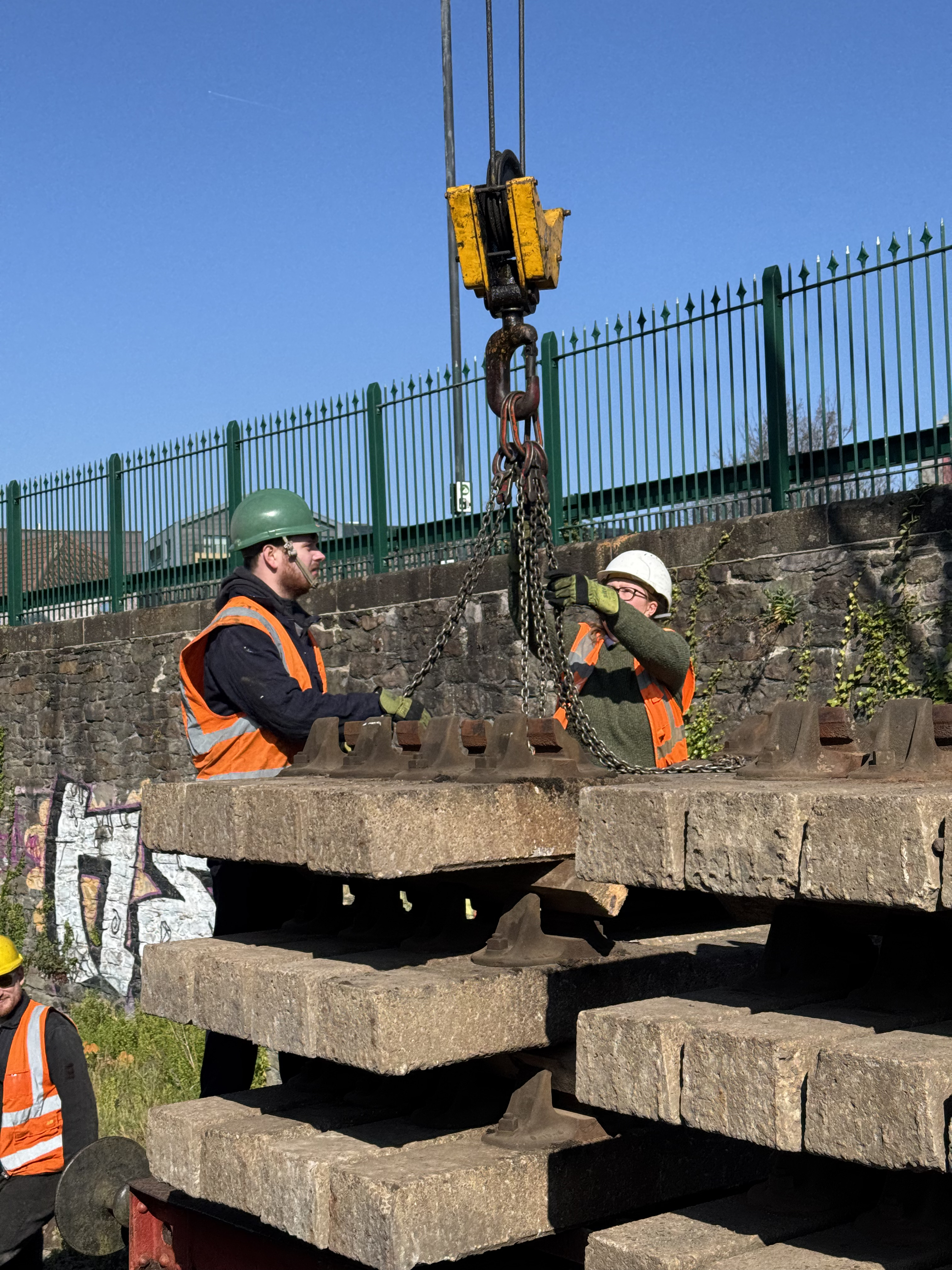We put our cargo handling and crane direction training as seen at Docks Heritage Weekend to good use. Using the brothers (dual chain hooks) enables 2 sleepers to be loaded at a time and stacked neatly on the siding.