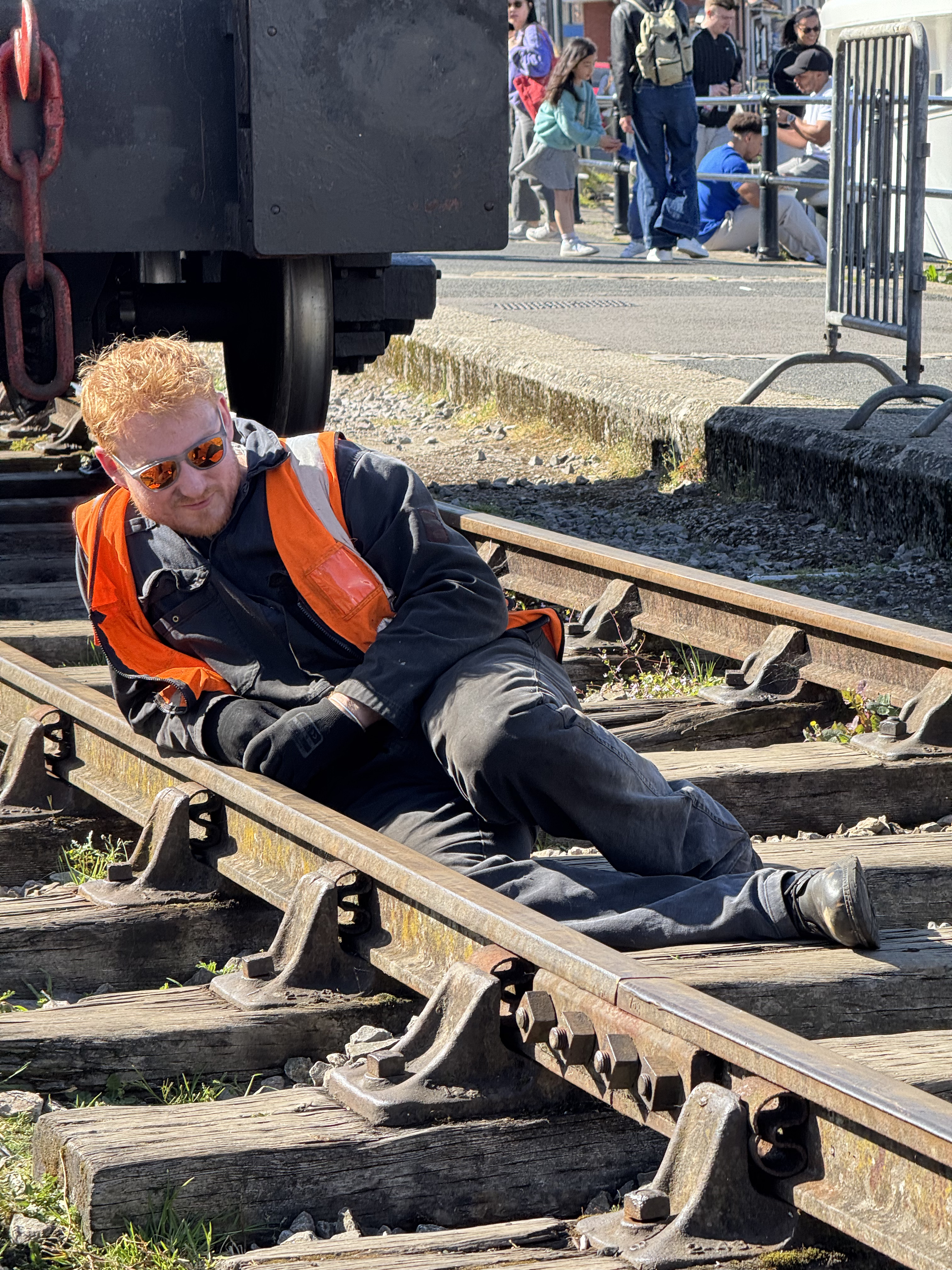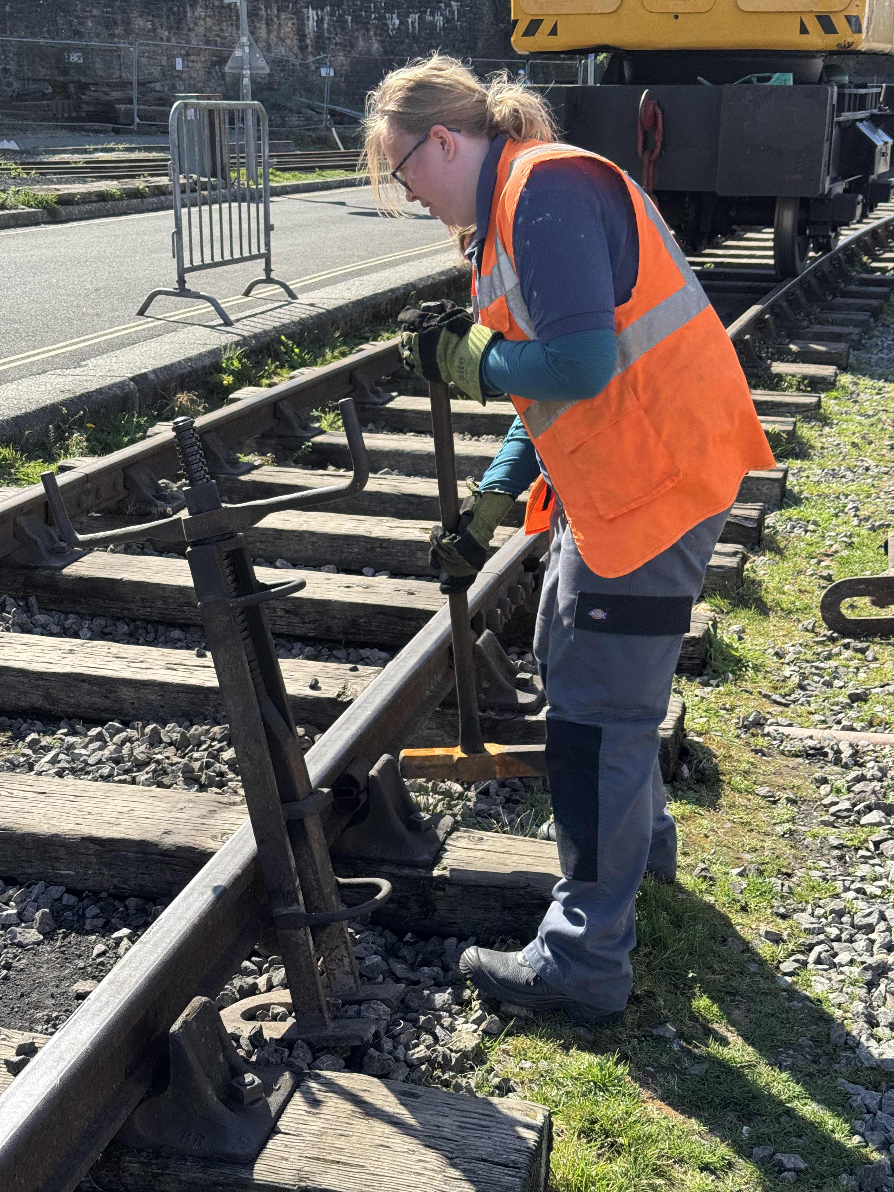 With that done and the wagon returned to the yard, in the afternoon the team were jacking and packing sleepers on the running line by the steam crane, as well as slewing the rails to ease the curve either side of the rail join. This required multiple jacks and a lot of sweat!