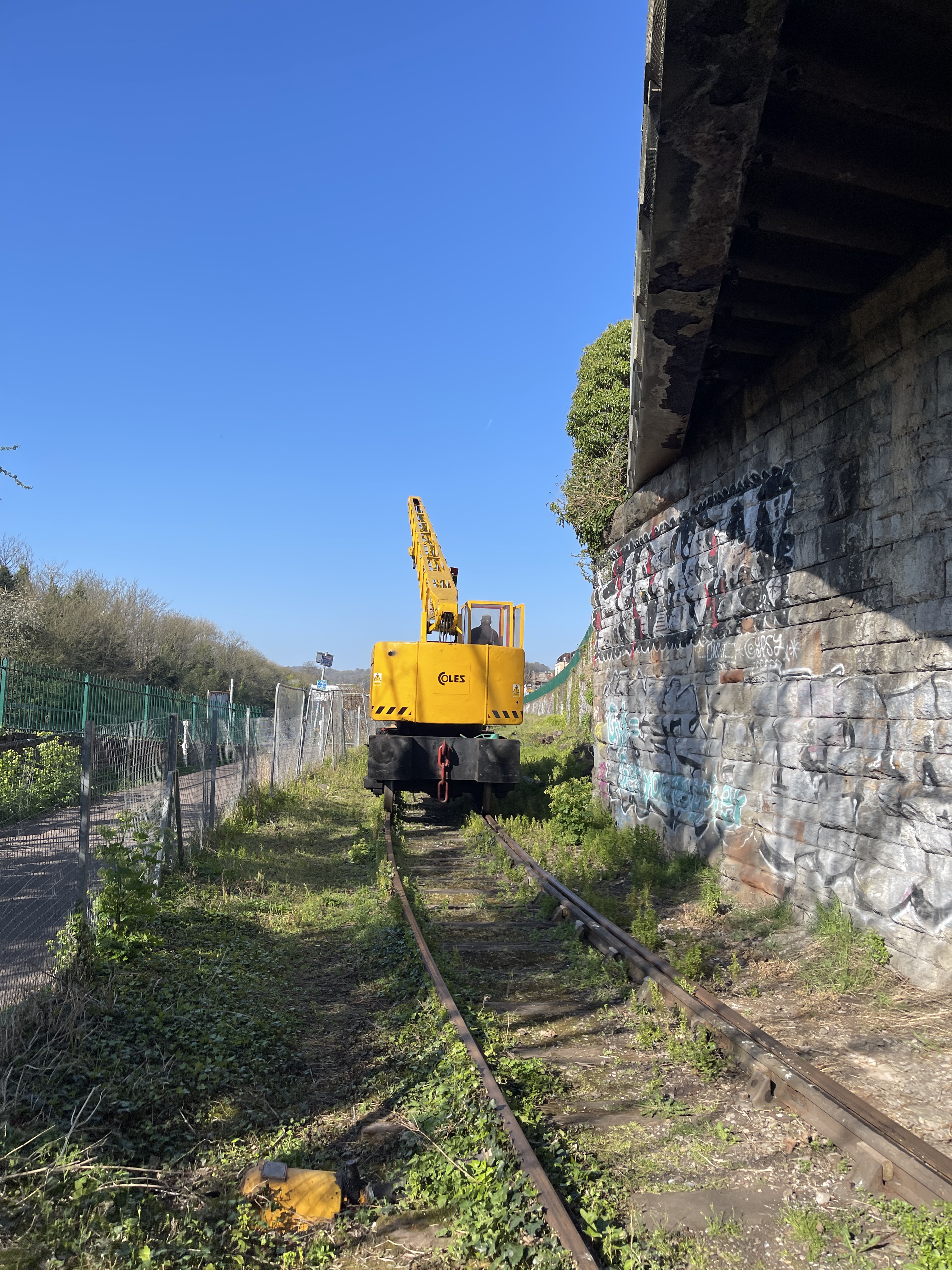 The sleepers were unloaded on to one of the flat wagons earlier in the week. The Coles Crane was to be used but needed to be on the East side of the wagon, so Larry was used to push the truck up the quayside and enable the Coles to couple up. The Coles then propelled the wagon up the branch to the siding alongside Cumberland Road bridge.