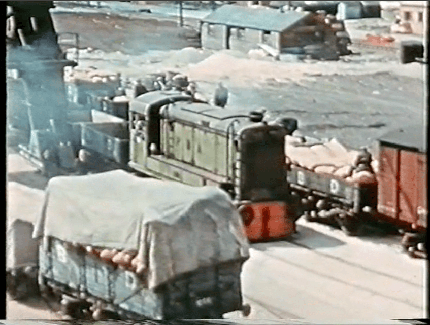 An unidentified Hudswell Clarke at Avonmouth, sporting the early green livery and raised PBA lettering. This example has a long box on the running board so is possibly ‘Tintagel’ (screenshot from ‘Bristol – Port of Many Trades’, property of Bristol Museums)